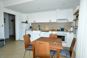 Spacious living area with a modern kitchen